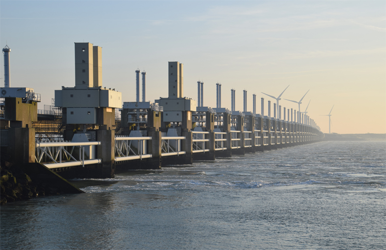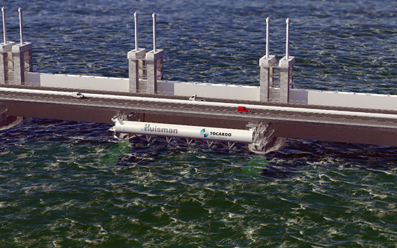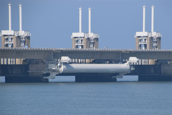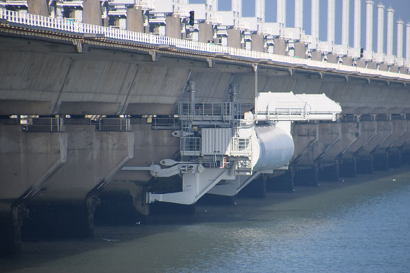 Op 17 juni 2015 installeerde het Nederlandse bedrijf Tocardo deze draagconstructie met 5 getijdenturbines tussen twee pijlers bij het zuidelijke eind van de kering. Van de weg af niet te zien, daarom deze artist's impression. De turbines werken zowel bij eb als bij vloed, en wekken 1,2 MW op (genoeg voor 1000 huishoudens). Dit wordt een boeiende ontwikkeling!